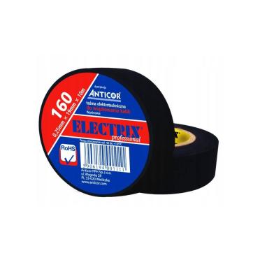 160 Electrix®je profesionální černá textilní lepicí izolační páska z bavlny s lepidlem na bázi syntetického kaučuku s velkou pevností v tahu.Vlastnosti:Má vysokou lepivost, snadno se přizpůsobuje členitému podkladuJe odolná proti povětrnostním vlivůmŠiroký rozsah pracovních teplot – 40 °C až +120 °C.Využití:Upevňování a svazování elektroinstalací v automobilovém průmyslu.Rozměr:19mm x 10m