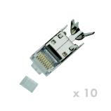 STP stíněný konektor RJ45 (8p8c) pro zakončení kabelů strukturované kabeláže typu drát. Balení obsahuje 10 ks Provedení pro: drát (solid) Vhodný pro kabely kategorie: cat.7 a cat.6a Stínění: ano