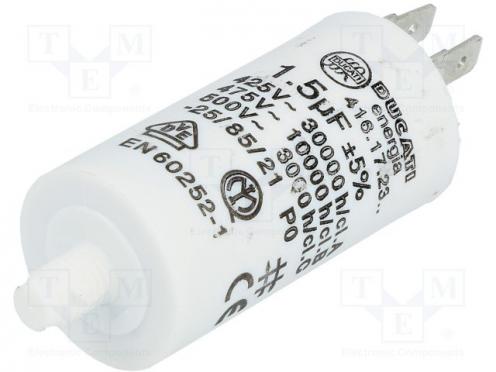 Výrobca DUCATI ENERGIA Typ kondenzátora polypropylénový Použitie kondenzátorov pre motory, pracovný Kapacita 1,5µF Rozmery telesa Ø28x55mm Pracovná teplota -25...85°C Tolerancia ±5% Životnosť 10000h Vývody konektory 6,3mm Upevnenie skrutka M8 Súprava obsahuje bez podložky a matice Pracovné napätie 475V AC