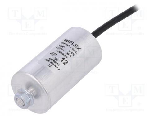 Výrobca MIFLEX Typ kondenzátora polypropylénový Použitie kondenzátorov pre motory, pracovný Kapacita 12µF Rozmery telesa Ø40x75mm Pracovná teplota -25...85°C Tolerancia ±5% Životnosť 30000h Vývody vodiče 250mm Upevnenie skrutka M8 Séria kondenzátorov MKSP-5AL Verzia 4 Pracovné napätie 425V AC