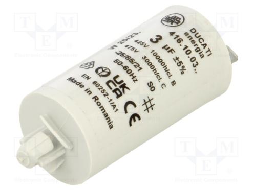 Výrobca DUCATI ENERGIA Typ kondenzátora polypropylénový Použitie kondenzátorov pre motory, pracovný Kapacita 3µF Rozmery telesa Ø28x55mm Pracovná teplota -25...85°C Tolerancia ±5% Životnosť 10000h Vývody konektory 6,3mm Upevnenie FAST FIX Upevnenie zatlačované Súprava obsahuje bez podložky a matice Pracovné napätie 400V AC
