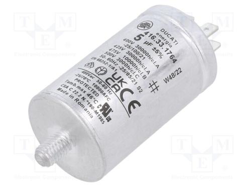 Výrobca DUCATI ENERGIA Typ kondenzátora polypropylénový Použitie kondenzátorov pre motory, pracovný Kapacita 5µF Rozmery telesa Ø35x60mm Pracovná teplota -25...85°C Tolerancia ±5% Životnosť 30000h Vývody konektory 6,3mm Upevnenie skrutka M8 Súprava obsahuje bez podložky a matice Pracovné napätie 400V AC