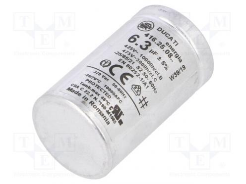 Výrobca DUCATI ENERGIA Typ kondenzátora polypropylénový Použitie kondenzátorov pre motory, pracovný Kapacita 6,3µF Rozmery telesa Ø35x60mm Pracovná teplota -25...70°C Tolerancia ±5% Životnosť 10000h Vývody konektory 6,3mm Súprava obsahuje bez podložky a matice Pracovné napätie 425V AC
