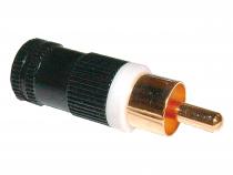 Konektor CINCH na kabel přímý, vidlice, černá s bílým pruhem, plast.