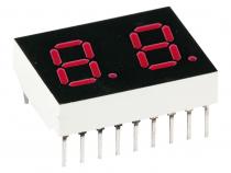LED displej 10 mm, barva: červená Počet znaků: 2 Společný vývod: anoda Barva: červená Desetinná tečka: Vpravo Max. proud segmentem: 30 mA Úbytek napětí v propustném směru: 2-2,5 V Svítivost: 1,2 mcd Zapojení číslic: Samostatné vývody