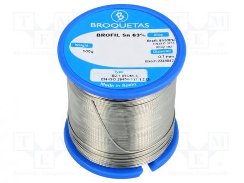 Výrobca BROQUETAS Typ spájky na mäkké spájkovanie Podoba spájkovací drôt Zloženie zliatiny Sn63Pb37 Priemer 0.7mm Hmotnosť 500g Druh spojiva olovené Druh balenia cievka Druh taviva halogénový Druh taviva kalafóniový Druh taviva No Clean Použitie preparátu v elektronickom priemysle Zhodné s normou EN 29454-1 Zhodné s normou EN-ISO 9453 Zhodné s normou J-STD-004