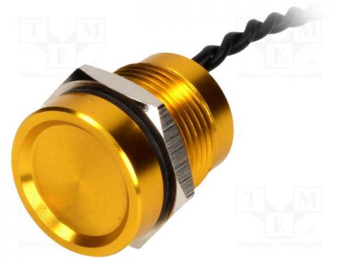 Výrobca ONPOW Typ prepínača piezoelektrický Počet všetkých polôh 2 Usporiadanie kontaktov SPST-NO Zaťažiteľnosť kontaktov AC @R 0.2A / 24V AC Zaťažiteľnosť kontaktov DC @R 0.2A / 24V DC Stupeň ochrany IP68 Spôsob prepínania OFF-(ON) Podsvietenie nie je Vývody vodiče 30mm Pracovná teplota -40...75°C Elektrická životnosť 50000000 cyklov Max. prúd kontaktov 0.2A Sila pre prepnutie 6N Rozmery montážneho otvoru Ø16mm Tvar tlačidla konkávny Materiál korpusu hliník Farba telesa zlatá Spínané napätie max. 24V AC Spínané napätie max. 24V DC Počet stabilných polôh 1