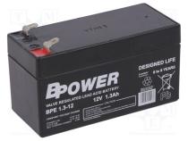 Výrobca BPOWER Typ batérie kyselinovo-olovené Menovité napätie 12V Objem 1.3Ah Technológia AGM Vlastnosti akumulátorových batérií bezúdržbový Vonkajšie rozmery 97x43x52mm Životnosť 6-9 rokov Vývody konektory 4,8mm Hmotnosť 0.6kg Použitie akumulátorový batérií poplašné systémy Použitie akumulátorový batérií systémy nepretržitého napájania Výrobná séria BPE