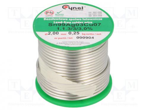Výrobca CYNEL Typ spájky na mäkké spájkovanie Podoba spájkovací drôt Zloženie zliatiny Sn99Ag0,3Cu0,7 Priemer 2mm Hmotnosť 250g Druh spojiva bezolovnaté Druh balenia cievka Druh taviva bezhalogénový Druh taviva F-SW32 Druh taviva No Clean Zhodné s normou EN-ISO 9453 Zhodné s normou PN EN 29454 1.1.3 Zhodné s normou RoHS 2002/95/EC