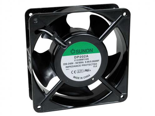 Ventilátor Sunon 120x120x38, 220-240 VAC/90 mA, Příkon = 16,00 W, Otáčky = 2400 RPM, Ložisko = kuličkové, Průtok vzduchu = 78 CFM/ 132,52 m3/h, Hlučnost = 34,0 dBA Vývody = faston, Délka vývodů = mm Hmotnost = 550,0 g Poznámka: Označení výrobce: DP202A.2123MBT.GN